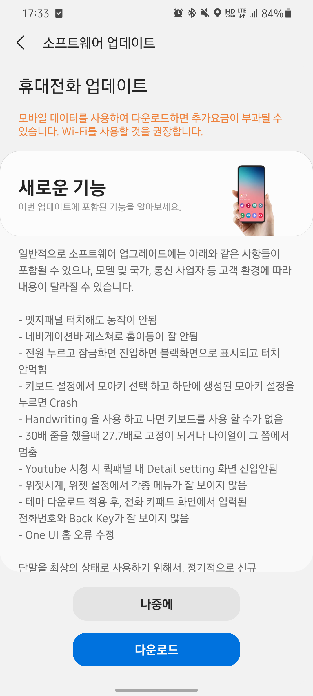 2531.43MB에 달하는 업데이트를 다운받은 후 설치를 진행합니다! 넘버링이 바뀌는 메이저 업데이트이다 보니 시간이 꽤 오래 걸립니다. 약 20분 정도 걸렸네요. 재부팅이 된 후 잠금화면에서부터 달라진 점들이 많이 보이네요!